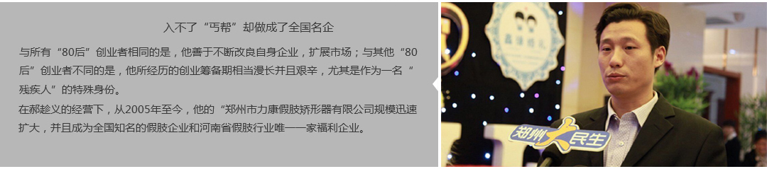 鄭州市力康假肢矯形器有限公司(簡稱力康),是一家專業(yè)從事假肢矯形器的設(shè)計、研發(fā)、制作及裝 配的專業(yè)機構(gòu)。成立于1992年是河南省唯一一家福利企業(yè)。力康下設(shè)業(yè)務(wù)部、技術(shù)部、住院部、康復 部、售后服務(wù)部,并配有現(xiàn)代化的裝配車間和功能齊全的訓練大廳,為殘疾朋友康復訓練提供了可靠 保障。總經(jīng)理穿戴假肢多年,有著豐富的臨床經(jīng)驗和親身體會;多年來,力康已為全國幾十萬名殘疾 朋友安裝上舒適、美觀、耐用的假肢和矯形器具,使他們更大限度地恢復了正常的工作和生活。“產(chǎn) 品即人品”的質(zhì)量理念、先進的技術(shù)、實惠的價格、完善的售后服務(wù)是力康取勝的法寶……